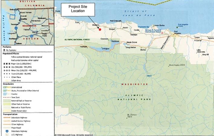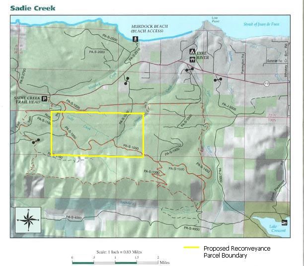 The proposed Sadie Creek Shooting Range is located approximately seven miles west of Joyce, nearly two miles south of State Highway 112, along a subsidiary road off of the Washington State Department of Natural Resources 1000 Road. The site lies at an elevation of approximately 700 feet, lying on a broad plateau area between the drainages of Sadie and Susie Creek. The legal description of the property is: the southeast corner of Section 6, T30 N,R9 WWM, together with Government Lots 19 and 34 in said section, together with the west half of the southwest corner of Section 5, T30 N, R9 WWM. The total acreage of the reconveyance is 320 acres. Of the 320 acres, approximately 80 acres will be used for the proposed shooting range and buffer.