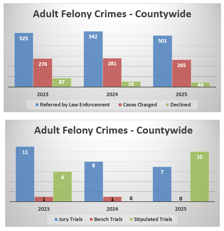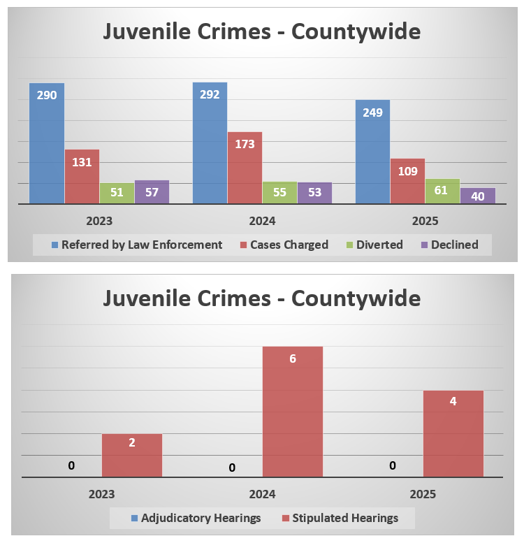 For the reasons stated above, while a case may be referred by law enforcement one year, it may not be charged or declined until one of the following years. This explains why the number of cases referred by law enforcement on an annual basis does not equal the combined number of cases charged, declined, and diverted on an annual basis.